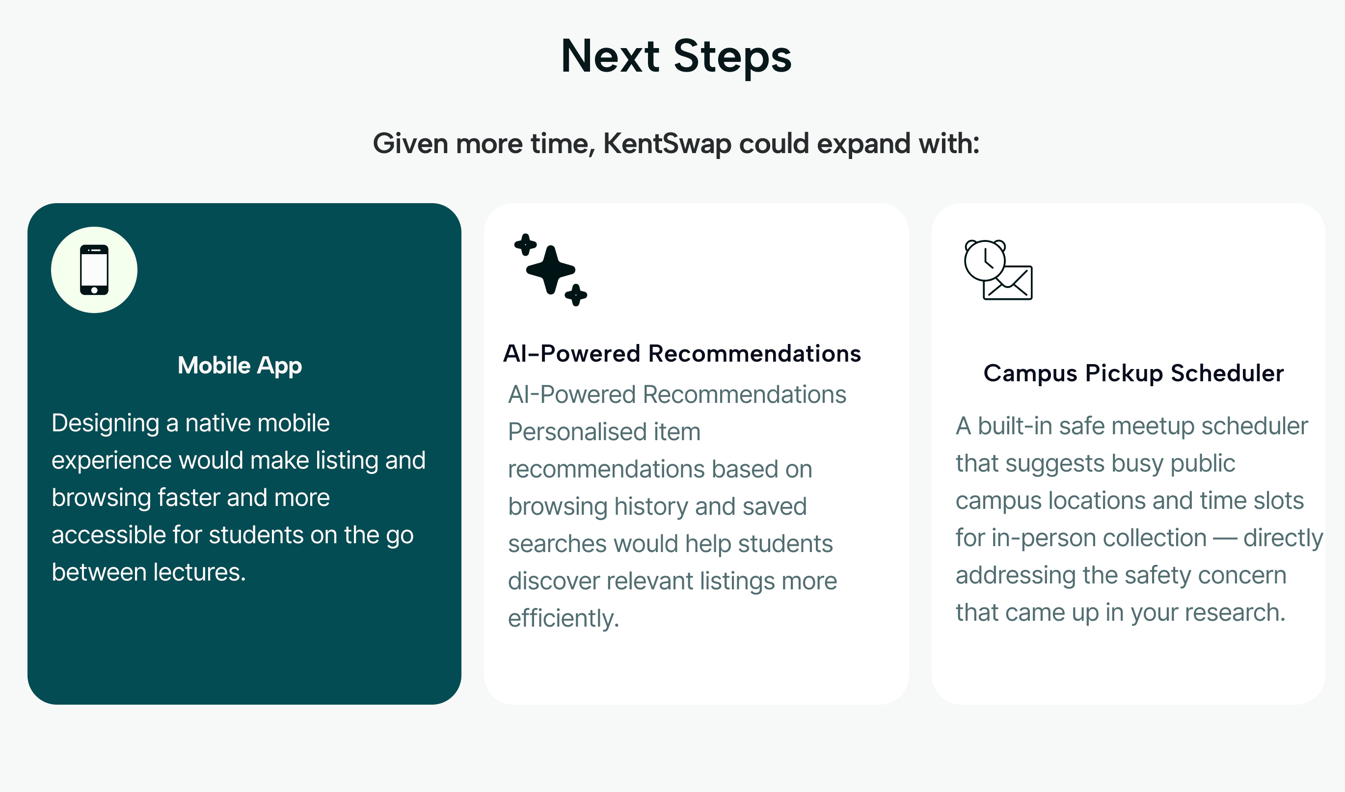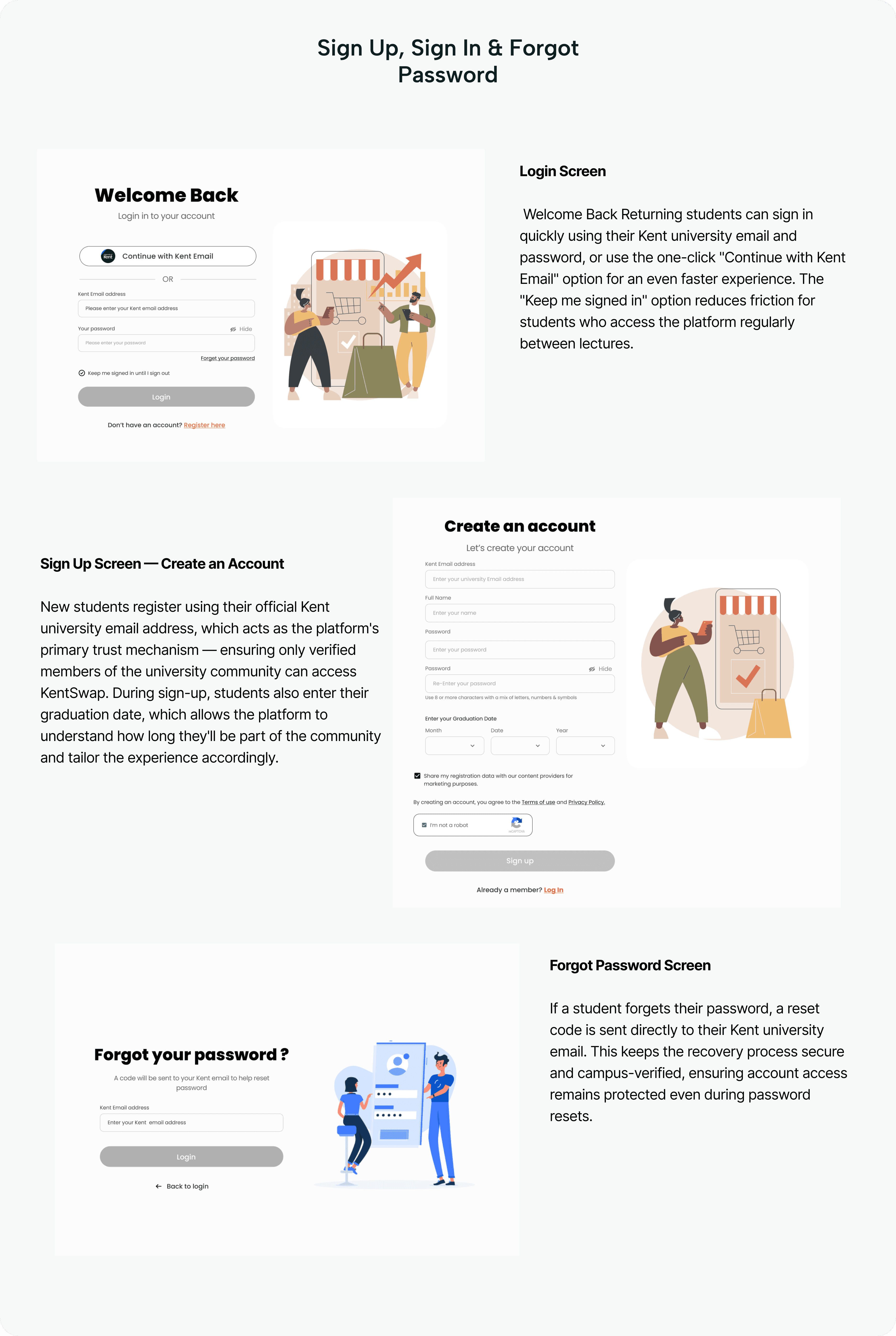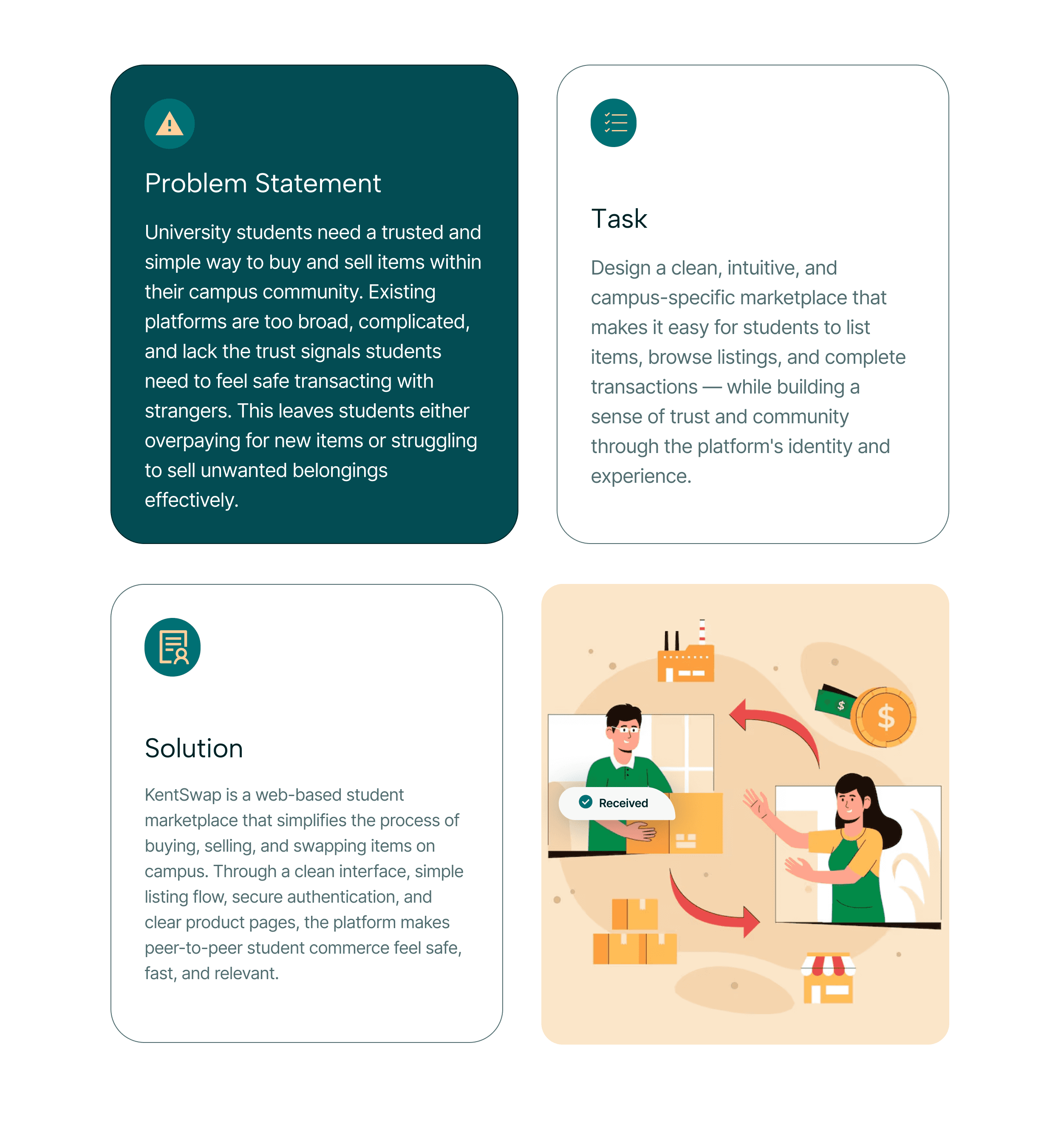 University students frequently face financial pressure, particularly around the cost of textbooks, electronics, and everyday essentials. While platforms like Facebook Marketplace and eBay exist, they are not designed with students in mind — they lack campus-specific trust, are cluttered with irrelevant listings, and can feel unsafe for first-time sellers. KentSwap was conceived as a solution built specifically for the University of Kent community — a dedicated space where students can confidently buy, sell, and swap items with people they share a campus with.