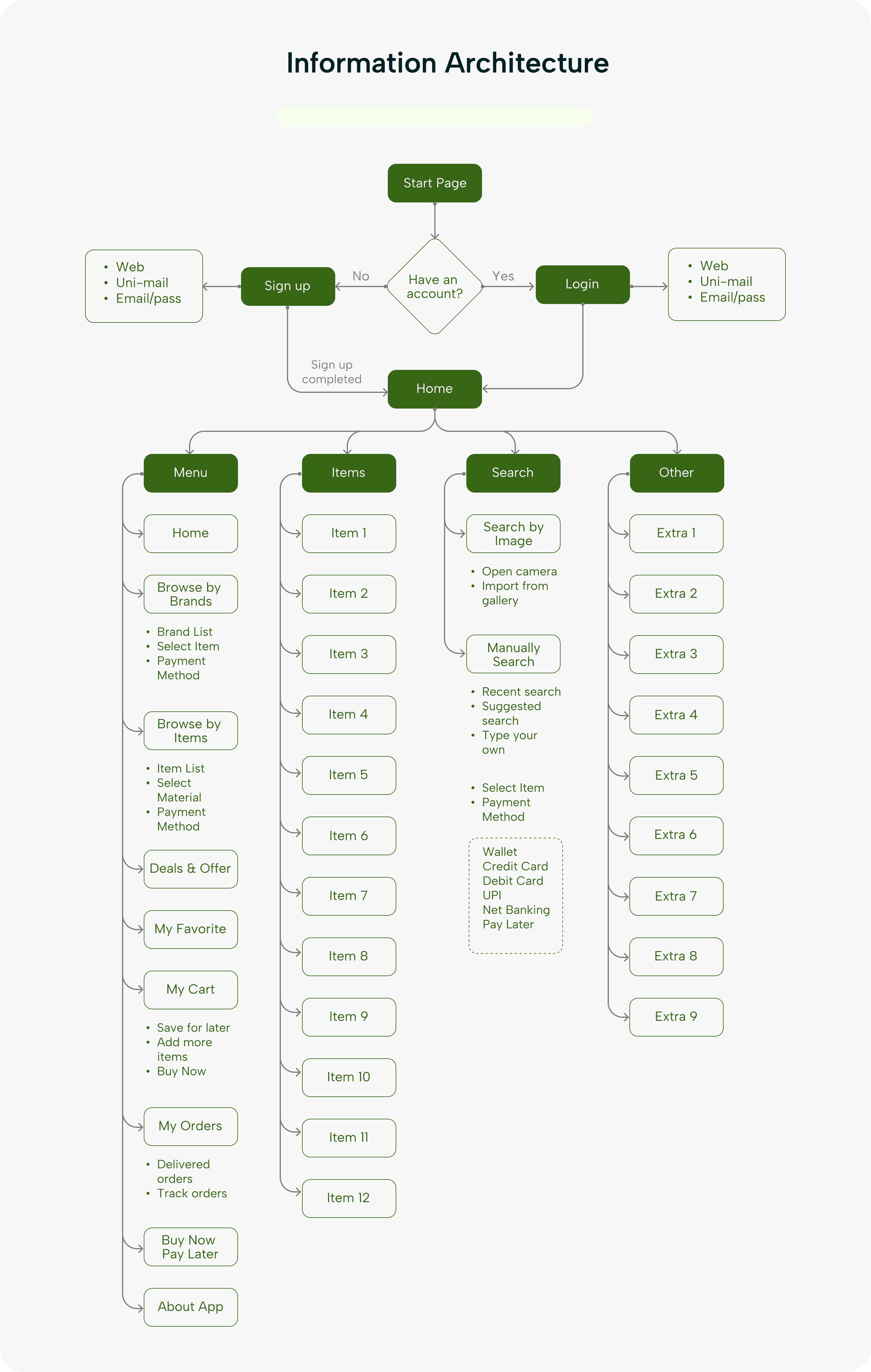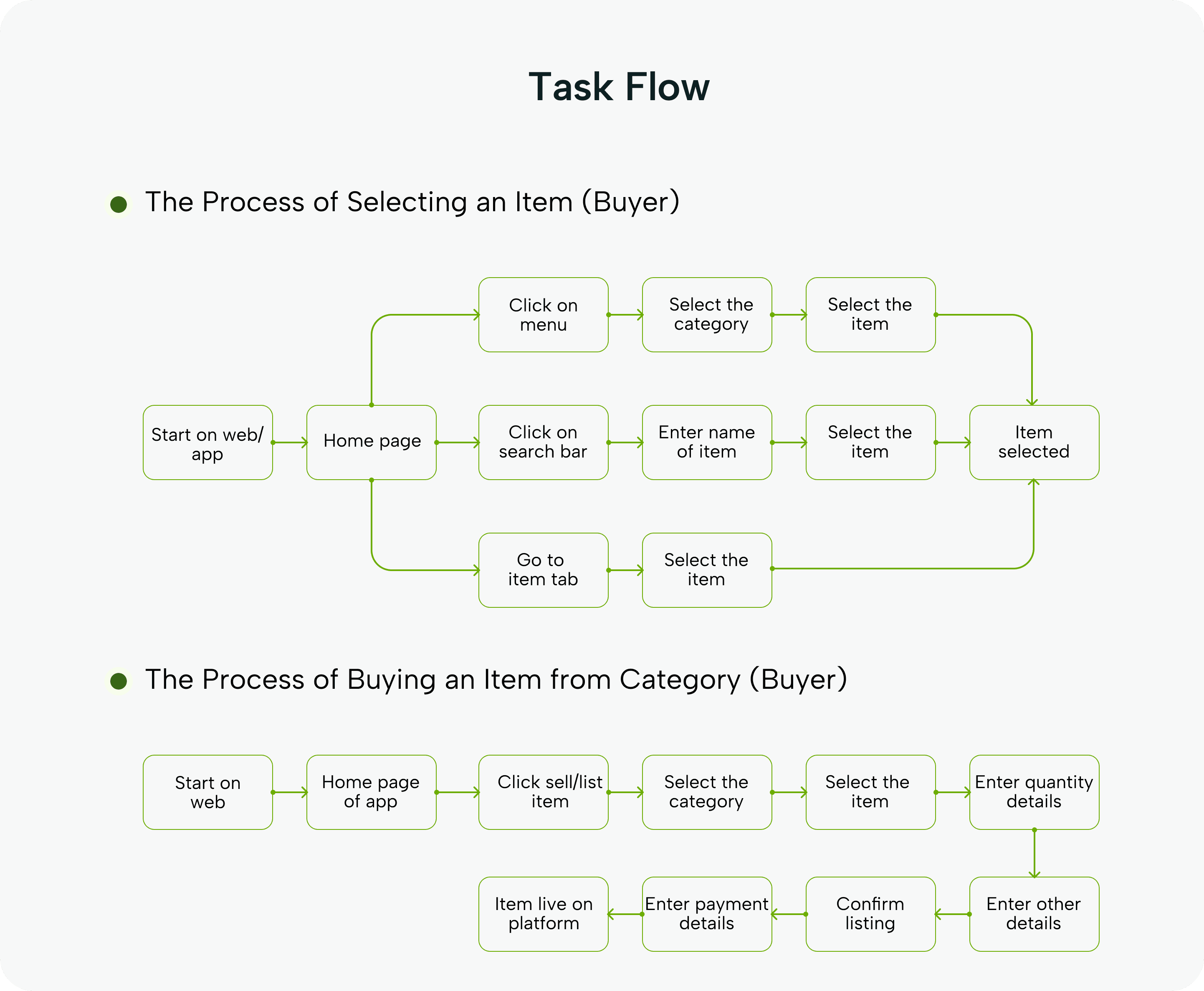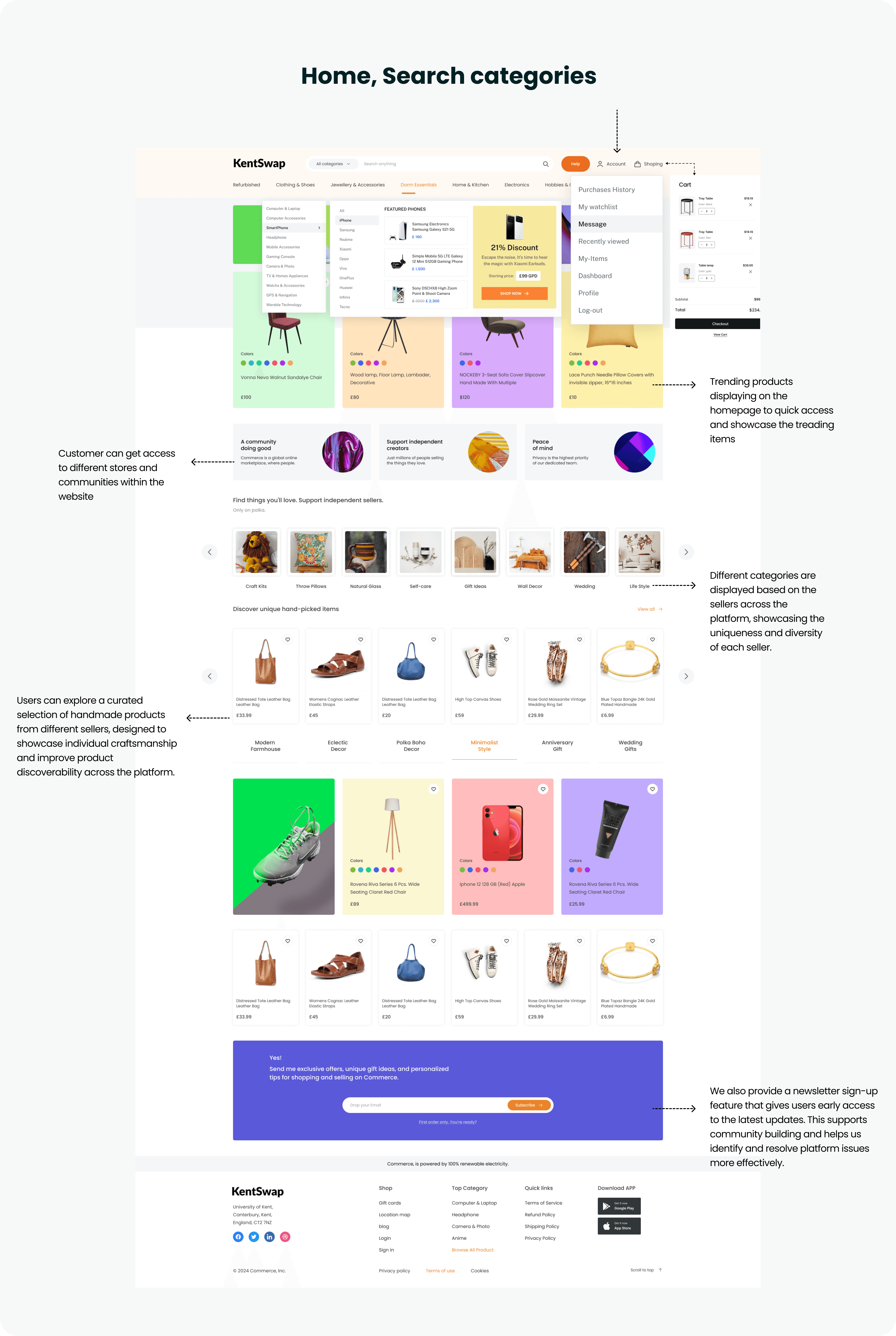 As the sole UI/UX Designer on this project, I was responsible for the end-to-end design process — from research and problem definition through to wireframing and high-fidelity UI design. This included designing the full buyer and seller experience, authentication flows, product pages, checkout, and account management screens.
