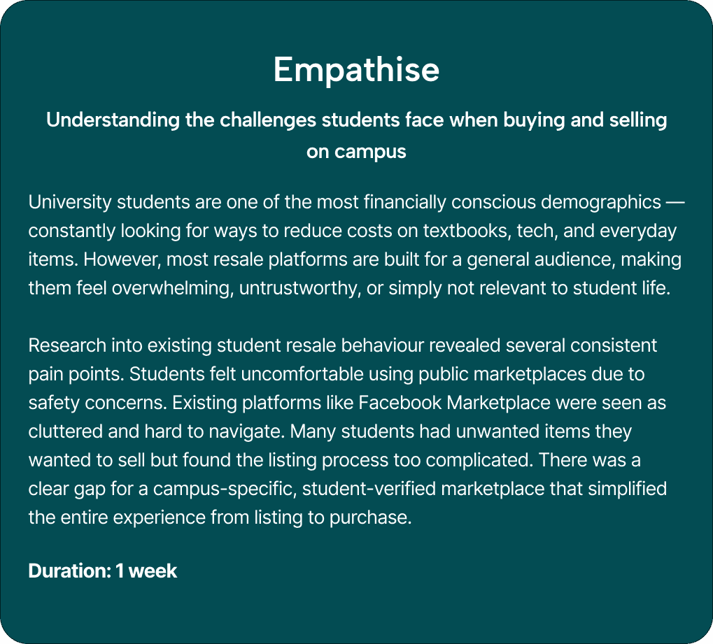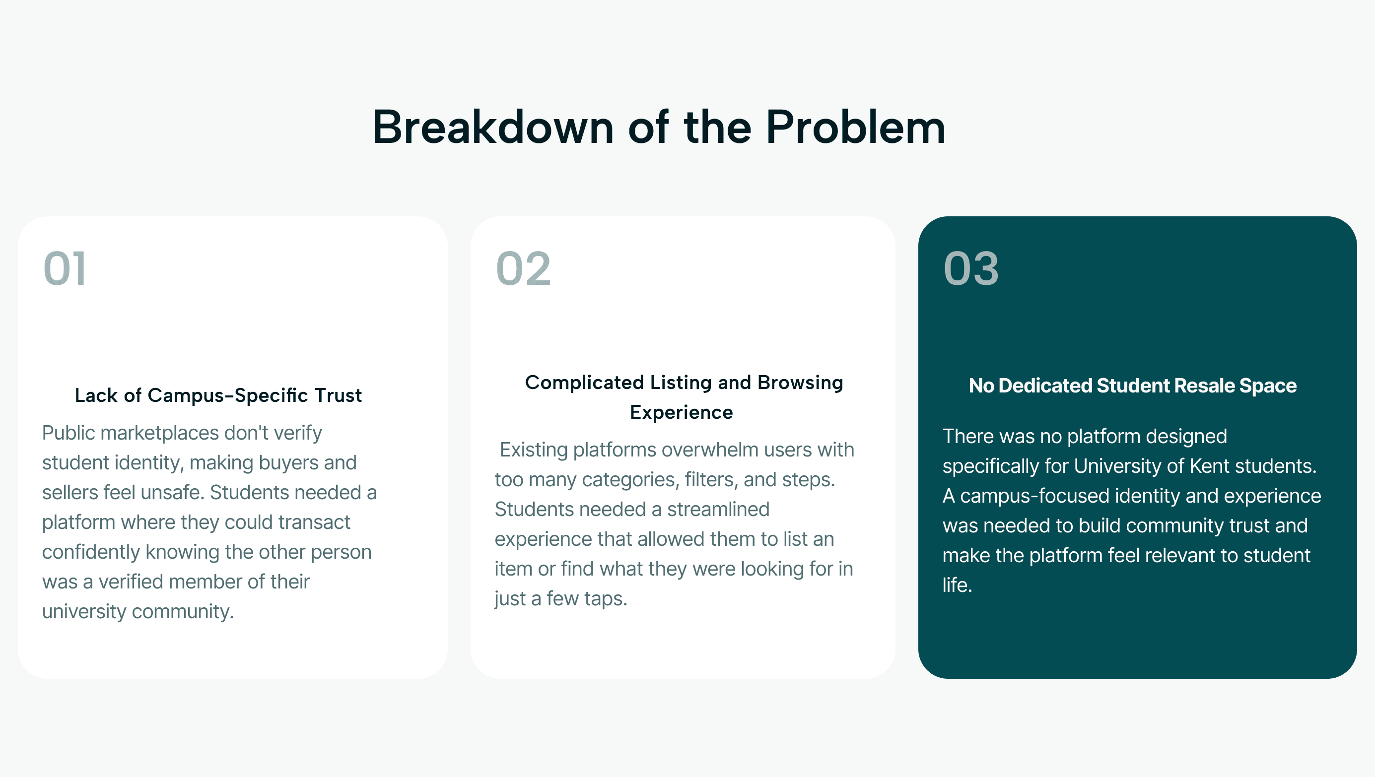 University of Kent students need a simple, trusted, and campus-specific marketplace because existing platforms are too broad, complicated, and lack the verification needed to make peer-to-peer student commerce feel safe and relevant.